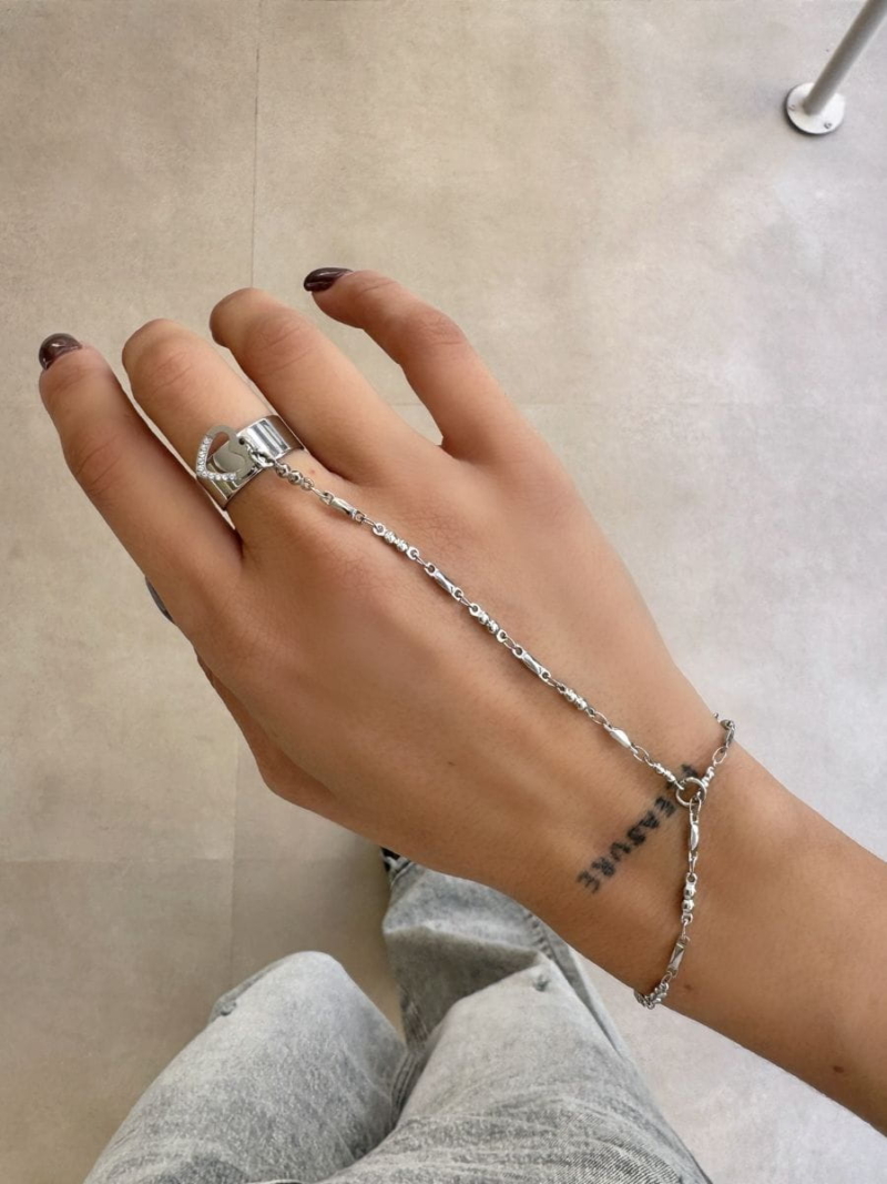 Κομψό hand chain κόσμημα που ενώνει βραχιόλι με δαχτυλίδι. Ατσάλινο κόσμημα με αντοχή για ιδιαίτερες εμφανίσεις. Φόρεσε το μόνο του ή συνδυαστικά με άλλα κοσμήματα για ένα elegant layering αποτέλεσμα.