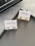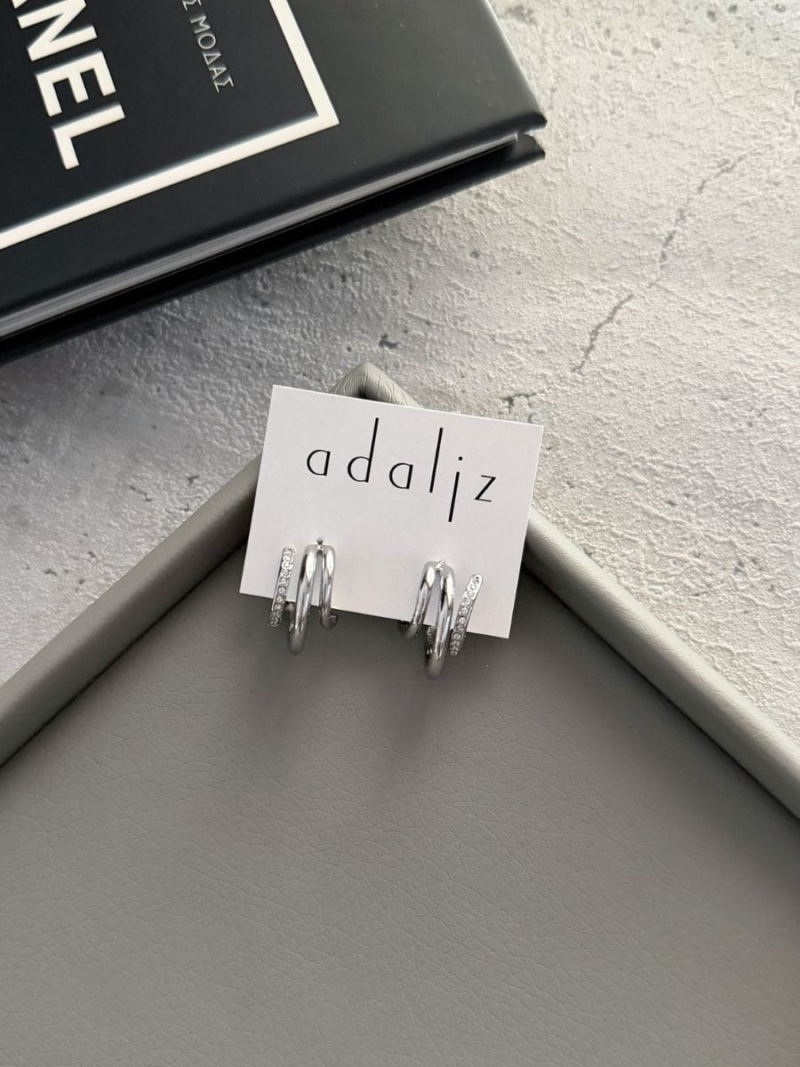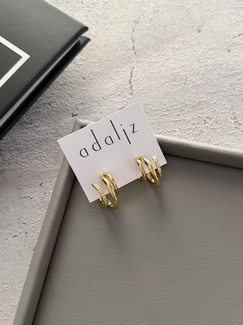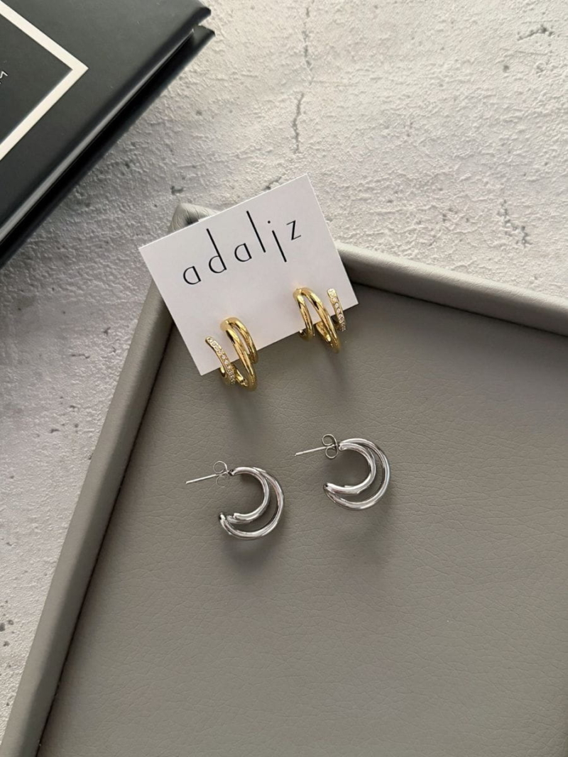 Σκουλαρίκια κρίκοι με τριπλή γραμμή, που συνδυάζουν λείο μέταλλο και λαμπερή λεπτομέρεια για κομψό, μοντέρνο αποτέλεσμα. Ιδανικά και για ear stacking.
