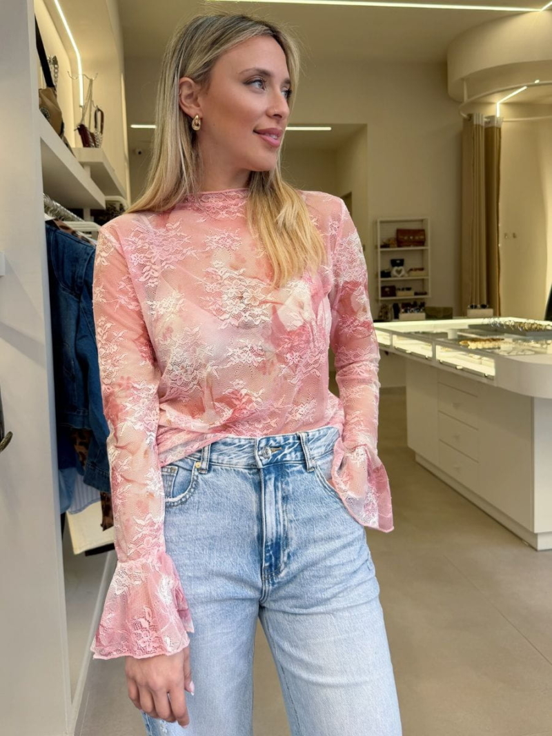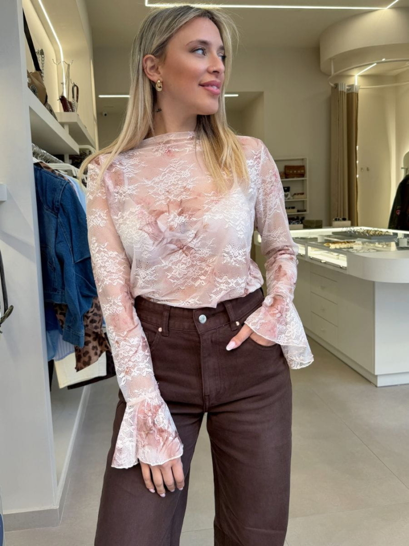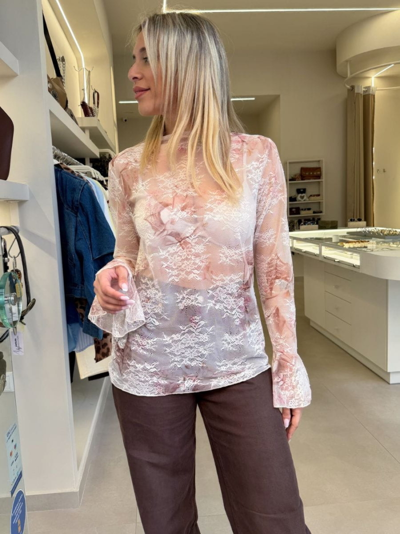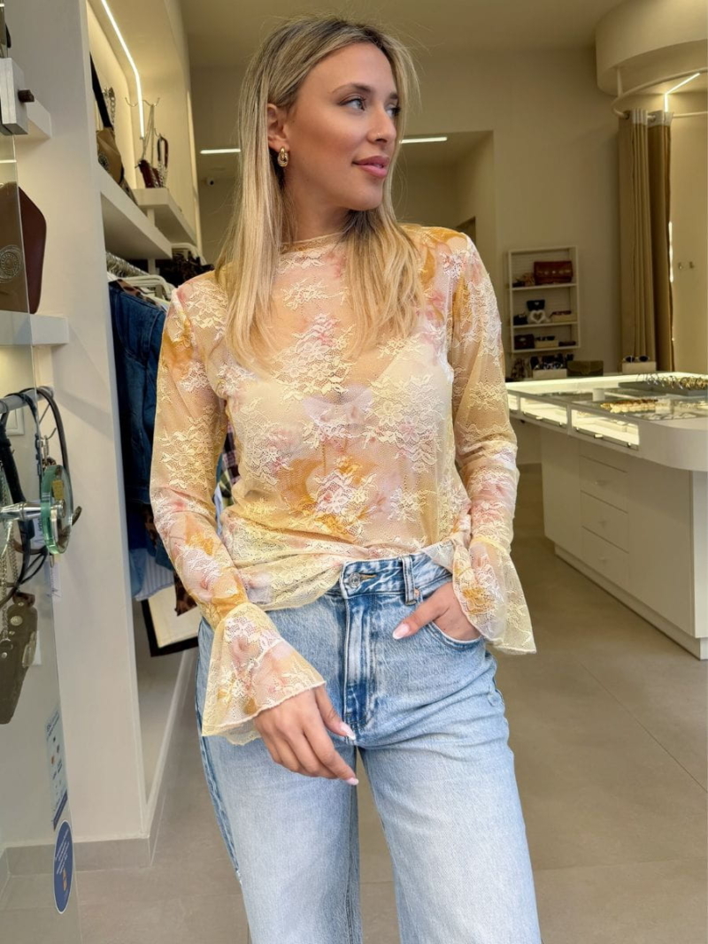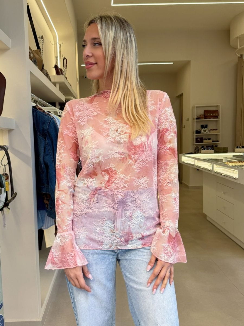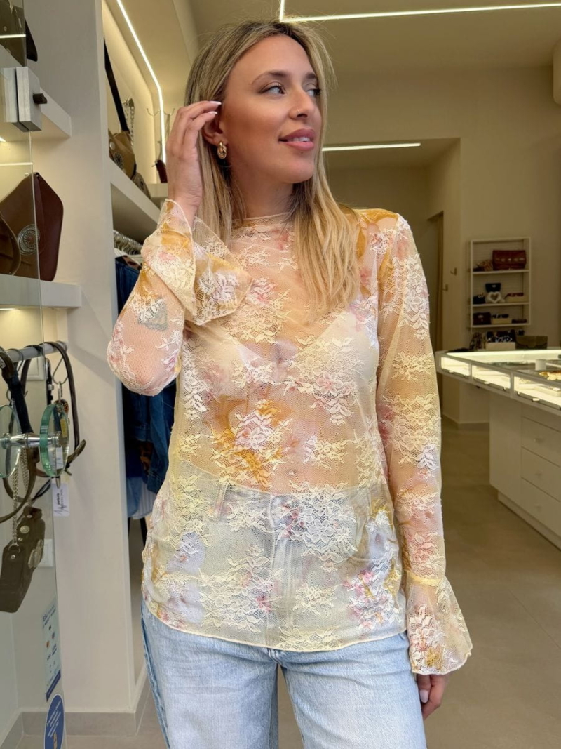 Ρομαντική δαντελένια μπλούζα με διακριτικό φλοράλ σχέδιο και μακριά μανίκια. Κομψή και θηλυκή επιλογή για καθημερινές και βραδινές εμφανίσεις.