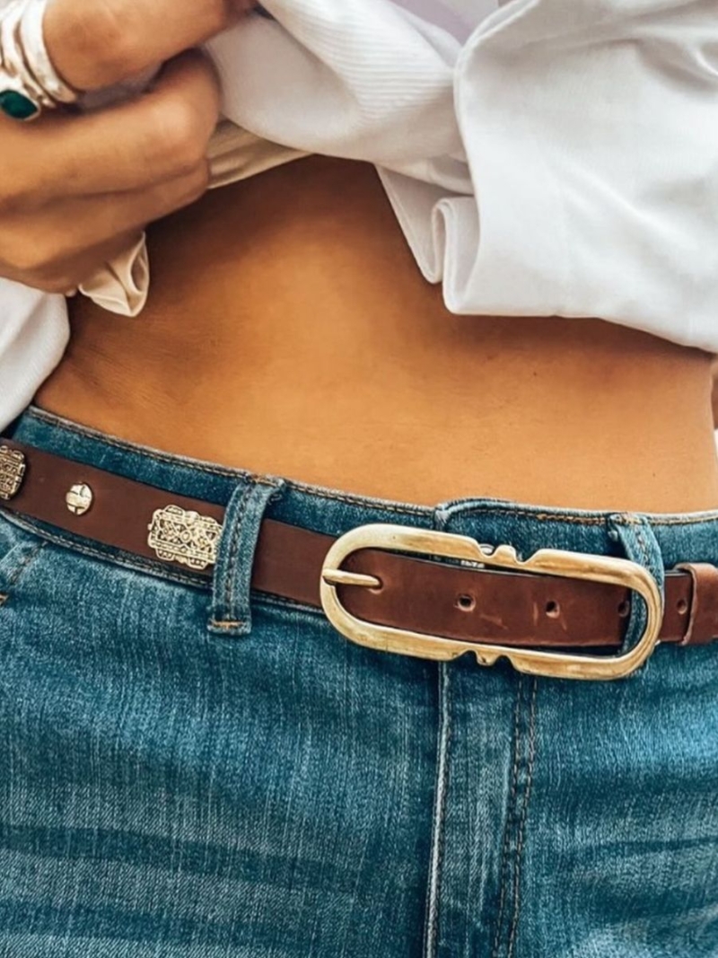 Δερμάτινη ζώνη με διακοσμητικά στοιχεία σε χρώμα χρυσό & ταμπά πέτρες. Κατασκευασμένη από ποιοτικό δέρμα, προσφέρει άνεση και στυλ σε κάθε σας εμφάνιση. Τα χρυσά διακοσμητικά στοιχεία προσθέτουν μια λαμπερή πινελιά, καθιστώντας την ιδανική επιλογή για να αναδείξετε κάθε ντύσιμο με εκλεπτυσμένο τρόπο.
